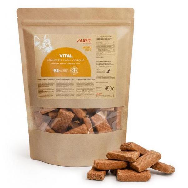 Contenu: 92% viande (100% lapin), 3% huile de tournesol, 2% levure de bière, 2% fibres végétales, 0,6% minéraux, 0,2% huile de foie de morue, 0,1% extraits de romarin, 0,1% algues